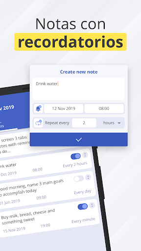 Supongamos que quieres establecer el hábito de beber agua. 💧 ¿Necesitarías otra app para hacer esto? Claro que no. Puedes establecer un recordatorio recurrente y regular cada una o dos horas. O, ¿tienes que hacer algo pero tienes miedo de olvidarlo incluso luego de haber recibido una notificación? Puedes configurar un recordatorio recurrente que te lo repita cada un minuto (sí, con esa frecuencia). ¡Esto te ayudará a tener en mente aquellas cosas que son importantes!