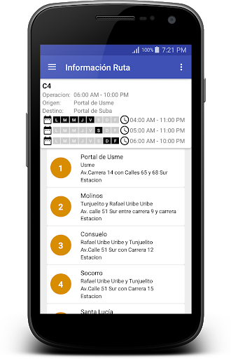 * Información del bus seleccionado,(Número de paradas y horarios de circulación de lunes a domingo y días festivos).