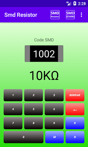 La aplicación cuenta ahora con la calculadora para códigos EIA 96 1%, para su uso se introducen dos dígitos numéricos el rango es de 01 al 96, el tercer dígito es una letra, esta letra se puede cambiar sin necesidad de borrar los números, el resultado se muestra automáticamente.