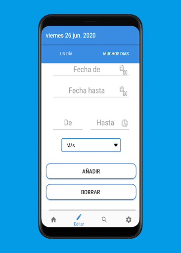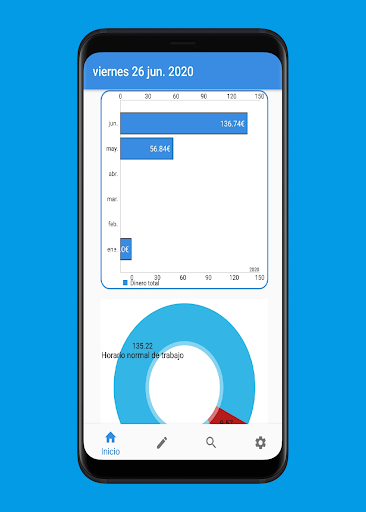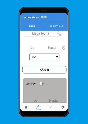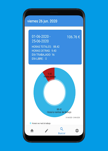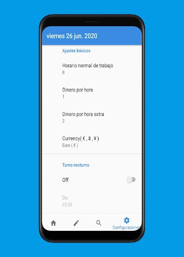 Cuando se registra por primera vez en la aplicación, el usuario debe poner en el horario normal de trabajo, el dinero por hora trabajada y el dinero por hora extra.