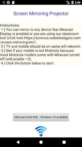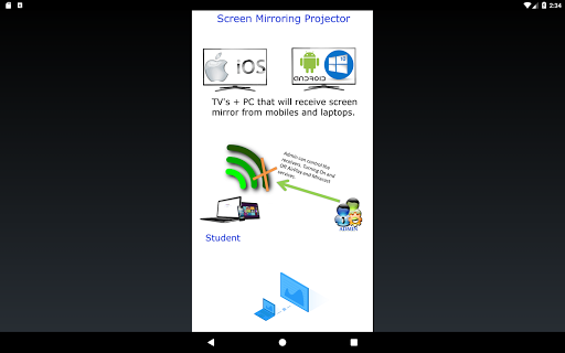 The App Screen Mirroring Projector will help you to scan and mirror the screen from your mobile, tablet or laptop to a smart TV/Displayscreen (miracast enabled), adapters and dongles wireless or to our App Screen Mirroring Control for the classroom/any, where you will have other modules such as Admin and Receptor and the teacher/admin can control when to turn on or turn off mirroring services.