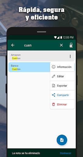 ► En la lista de notas puedes buscar, eliminar, deshacer si eliminaste por error, y cambiar el orden en que se muestran las notas en base a diferentes criterios.