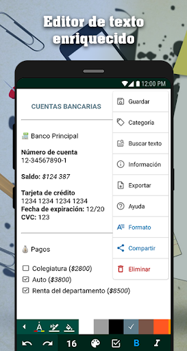 ► Editor de texto enriquecido que te permite dar estilo a tus notas, cuenta con las siguientes funcionalidades:
