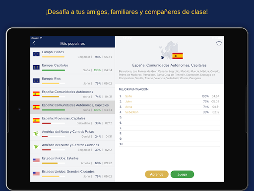 Ponte a prueba y mejora tus puntuaciones previas. Aumenta tus conocimietos con este divertido juego casi sin darte cuenta y ocupa tu espacio entre los mejores jugadores. ¡Llega hasta el número 1!