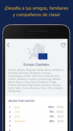 Elige una región y avanza hasta conocer el mundo entero. La app cuenta con más de 100 retos para poner a prueba tus conocimientos. Aprende a diferenciar las banderas de Noruega, Finlandia, Islandia y Dinamarca, a ubicar en el mapa a Uruguay y Paraguay o a localizar los ríos más importantes del mundo. Descubre las 25 ciudades más grandes del mundo o viaja desde las cordilleras montañosas más importantes del planeta hasta las islas más paradisíacas.
