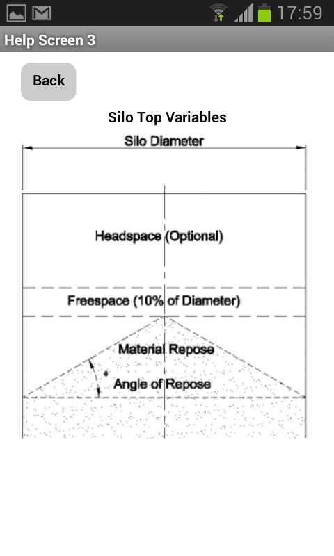 * For volume calculations the app requires the silo diameter, height, outlet diameter (if flat bottomed silo) and cone angle with outlet diameter (for conical outlet silo). All non-dependent fields can be left empty or set with 0 values.
