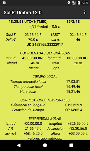 El programa muestra los principales parámetros solares correspondientes a la hora y fecha actuales o para una fecha y hora que se pueden configurar como se desee: