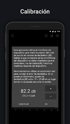 El valor de Sonómetro no es tan preciso como un medidor de sonido real, esto se debe a que la mayoría de los micrófonos del dispositivo están alineados con la voz humana. Para solucionar este problema, use un medidor de sonido real para ajustar el error de decibelios lo más cerca posible antes de usar. Si no posee un Sonómetro real, vaya a un lugar muy tranquilo donde el sonido no pueda oír y ajuste el valor de lectura a 20 ~ 30dB.