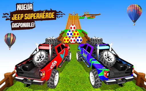 Este juego de turbo jeep de carreras Superhero Jeep Offroad Racing: Super Kids Drive 3D, presenta un ambiente tenso y súper genial, pistas de montaña agrietadas y coloridas, diferentes barreras y obstáculos, picos de montañas altas, rampas imposibles en el aire, pasillos estrechos y curvos para acrobacias y desafíos de conducción y carrera en jeep, puentes de madera, pelotas de fútbol coloridas y accesorios para anotar puntos e increíbles personajes 3D de animales dinosaurios para alegrarte en el punto de la carrera.