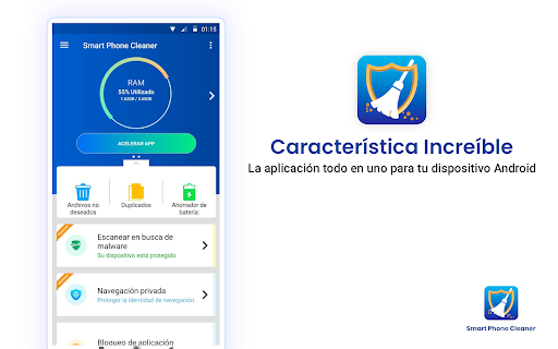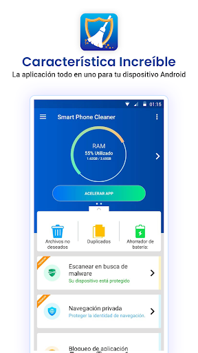 Cleaner For Android es una aplicación completa para dispositivos Android. Aumenta y optimiza el rendimiento de su dispositivo Android, al tiempo que elimina aplicaciones y archivos no deseados para recuperar espacio. Con su refuerzo de un toque, puede limpiar todos los archivos de caché en un lapso de tiempo rápido. Optimiza aún más la batería del teléfono, limpia todos los archivos basura, administra aplicaciones e incluso protege su dispositivo contra ataques de malware. Todos estos módulos se crean para mejorar el rendimiento general del dispositivo.