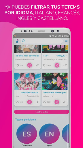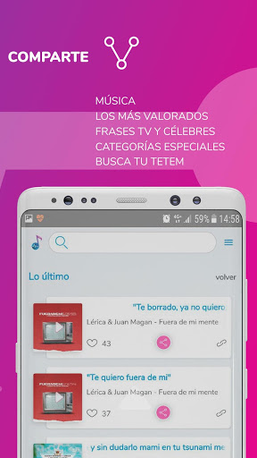 TALK THROUGH MUSIC es una app gratis, una app music creativa que facilita la comunicación de forma original y sencilla entre usuarios a través de plataformas de mensajería y en tus Redes Sociales usando fragmentos de música, canciones cortas o TETEMS, para transmitir mensajes y expresar emociones en formato cancion para compartir. Organizado por diferentes categorías y categorías especiales, artistas destacados y el top música 10 de TETEMS.