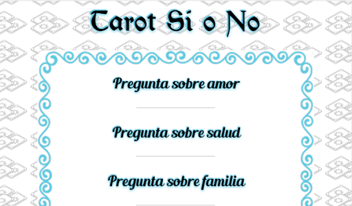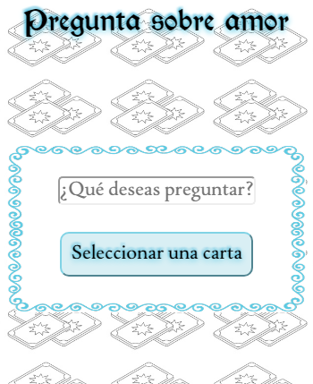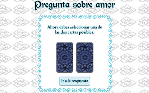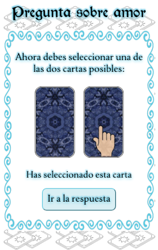 El funcionamiento es muy simple, seleccionas el ámbito que deseas preguntar, te pedirá que escribas la pregunta y luego debes seleccionar una carta de las dos posibles para realizar la tirada y te responderá junto la visualización de la carta que has seleccionado.