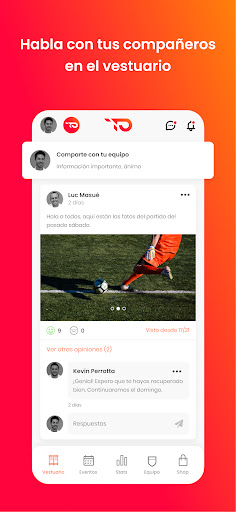 💬 SOCIAL: Disfruta de un espacio dedicado a cada equipo, el vestuario, donde cada miembro puede expresarse, reaccionar y compartir fotos, videos o documentos con todo el grupo. Crea un ambiente agradable y fortalece el espíritu de equipo.
