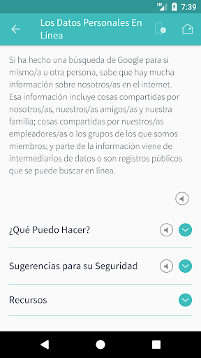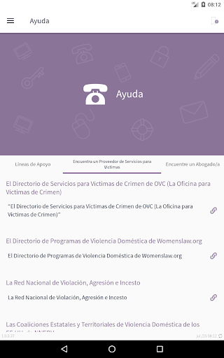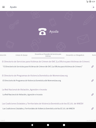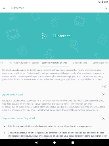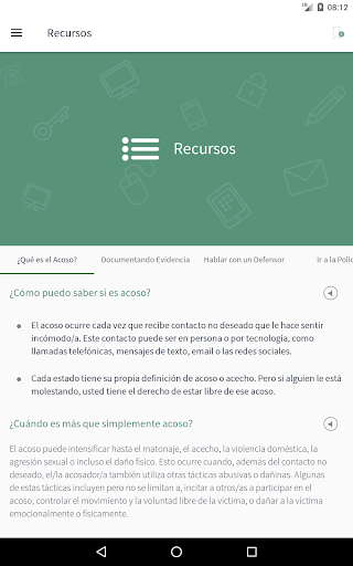 Aunque esta app contiene sugerencias de seguridad y privacidad, no tiene el propósito de ser una herramienta comprensiva para planes de seguridad. Por favor, hable con un/a intercesor/a de violencia doméstica o agresión sexual sobre lo que le está pasando y estrategias para su seguridad y privacidad.