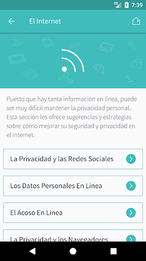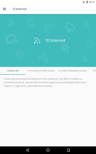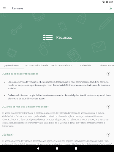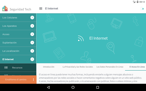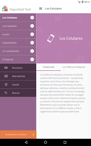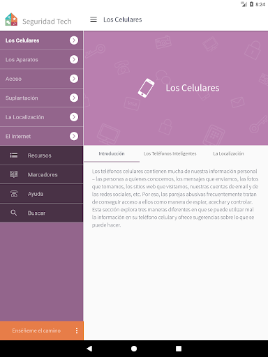 Bienvenido/a a la app de Seguridad Tecnológica. Esta app contiene información que le puede ayudar a alguien a identificar el acoso, el acecho, o el abuso facilitado por la tecnología, e incluye sugerencias sobre lo que se puede hacer. Aunque fue desarrollada para las personas que están experimentando acoso o abuso mediante el uso de tecnología, esta app también contiene sugerencias de seguridad y privacidad que le pueden ayudar a cualquier persona a utilizar la tecnología con más privacidad y seguridad.