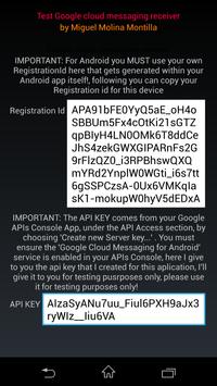 Esta aplicación le proporciona al usuario todo lo necesario para que desde un servidor remoto podamos verificar que nuestros mensajes llegan correctamente a los dispositivos android y que este lanza una notificación al usuario con el mensaje lanzado.La aplicación proporciona un Registration Id(RegistrationId), diferente para cada uno de los dispositivos en los cual se ha instalado, con el cual, mediante la API KEY(APIKEY) que se proporciona dentro de la app, podremos probar a lanzar notificaciones a la aplicación y verificar que desde nuestro servidor estamos enviando correctamente mensajes a nuestra aplicación android mediante la notificación que veremos en pantalla.