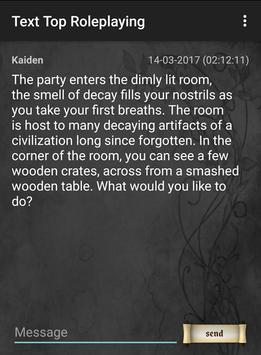 Text Top Roleplaying is an app designed from the ground up for roleplayers to have a simple, yet effective way to progress their roleplaying adventures when away from the table. In the modern age, people are busy, and we all miss the days of sitting around a table rolling dice. No longer! Text Top Roleplaying allows all players to connect to the same chat room via a simple password and continue the game when away from the table.