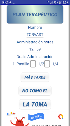 El texto de la notificación indica la medicación y hora de la próxima administración