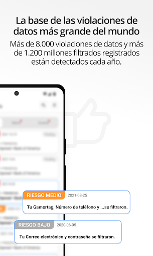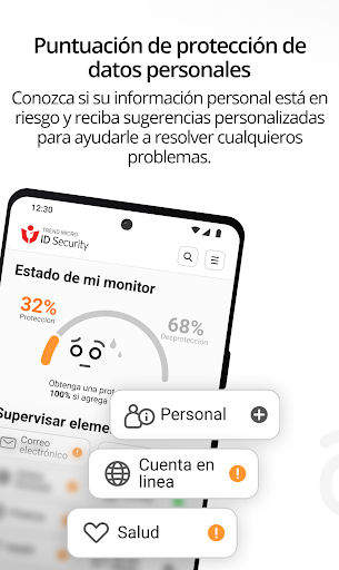 - Vea el nivel de riesgo de sus datos monitoreados en el panel y reciba consejos útiles sobre cómo puede mejorar su seguridad en línea.