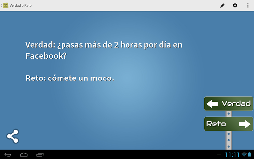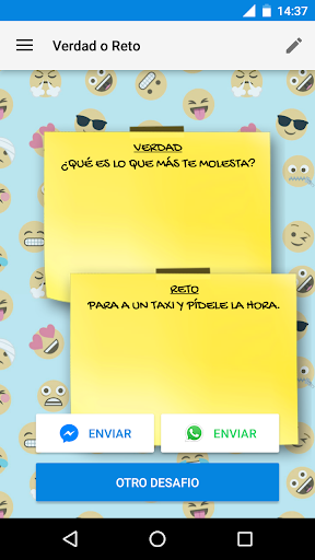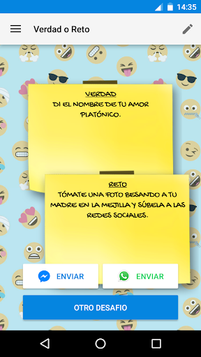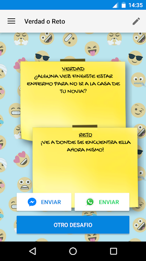 Todos las preguntas y desafíos son aportados por usuarios y nosotros los agregamos a la colección, así que si se te ocurre algún desafío o alguna pregunta puedes enviarlas desde la aplicación. También puedes crear uno personalizado y usarlo para jugar con tus amigos.
