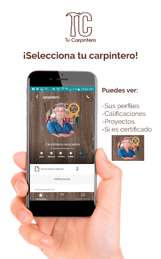 Con Tu Carpintero y desde tu celular podrás elegir al profesional que más se adapte a la necesidad de tu proyecto, según su especialidad y la ciudad donde estés ubicado, además podrás calificar su trabajo al momento de la entrega para facilitar la decisión de los demás al momento de hacer su elección.