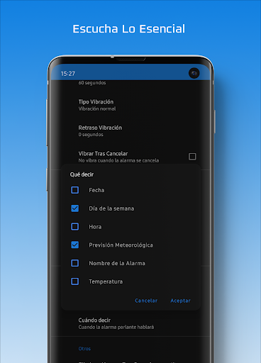 - Previsión meteorológica – se te mostrará cuando actives una alarma para que te prepares para el día!