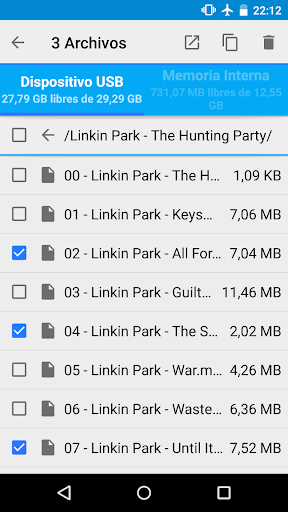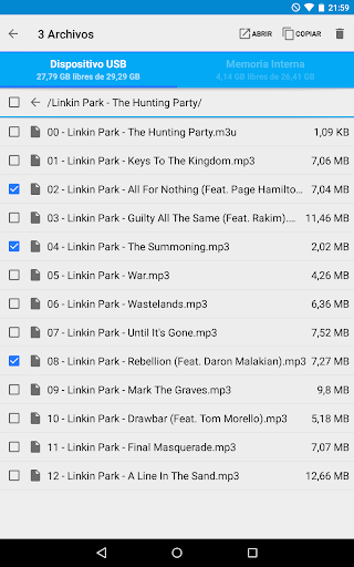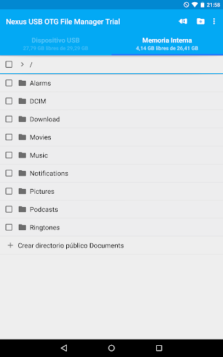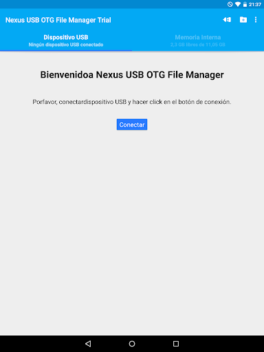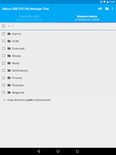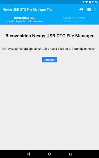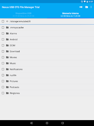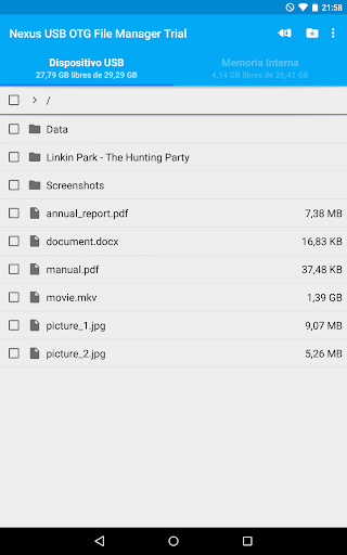 Esta es la versión gratuita de prueba de USB OTG File Manager for Nexus. Puede probar todas estas funciones en su dispositivos USB excepto la copia de archivos, y la apertura de archivos ha sido deshabilitada.