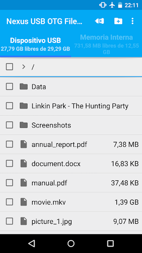 ¡USB OTG File Manager for Nexus le permite abrir sus archivos directamente desde su dispositivo USB! Solo necesita tener una App que lo pueda manejar. Para audio y video, recomiendo utilizar VLC.