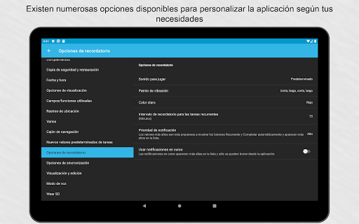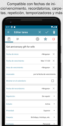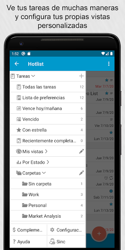 Funciona con Wear OS. Un complemento de Wear OS está disponible que te permite navegar y marcar tareas, y ver y posponer recordatorios. Los recordatorios de tus tareas aparecen como notificaciones en tu reloj a la hora que establezcas. Desde la notificación, puedes posponer el recordatorio o marcar la tarea como completada. (Todas las demás funciones enumeradas aquí son solo para teléfonos y tabletas).
