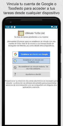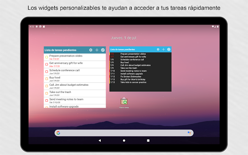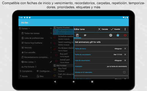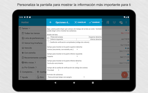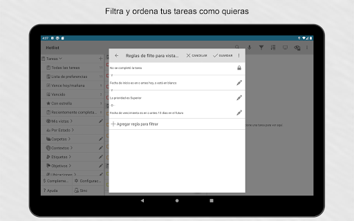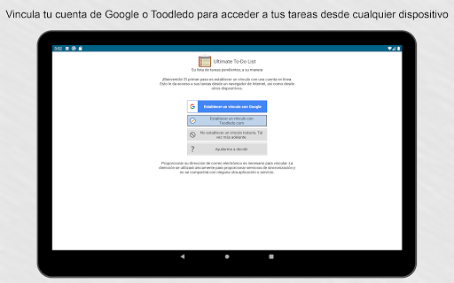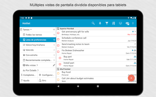 Mantente sincronizado. Vincula la app a una cuenta de Google o Toodledo.com y tus dispositivos se sincronizarán perfectamente. La sincronización puede ocurrir automáticamente.