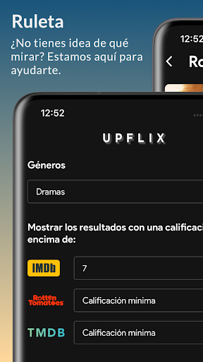 El modo Ruleta te ayuda a elegir películas y series en Netflix cuando no sabes qué ver. Simplemente crea tus filtros basados en categorías, puntuaciones de IMDB, TMDB y Rotten Tomatoes, y Upflix sugerirá algo de tu gusto.