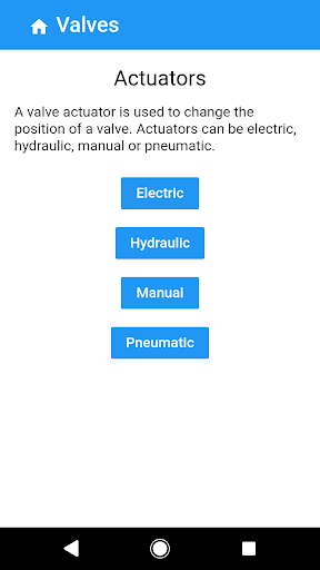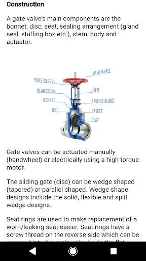 This app includes detailed information about the ball, butterfly, check, diaphragm, gate, globe, needle, pinch, plug, relief and safety valves! The app also includes information relating to the four different types of main valve actuator (electric, hydraulic, mechanical and pneumatic).