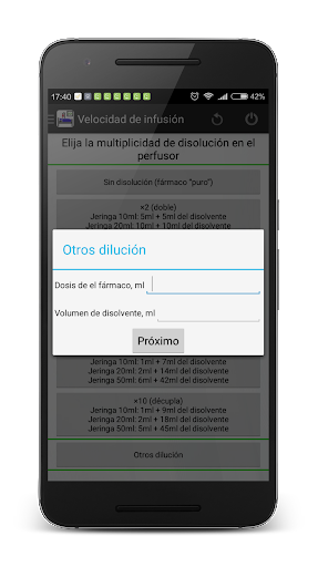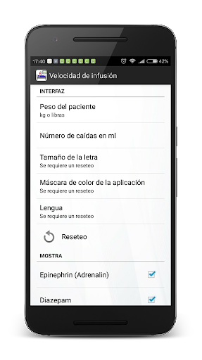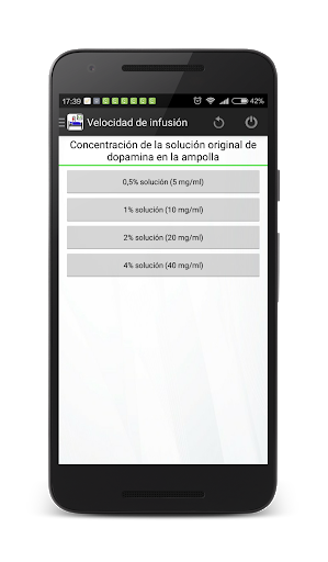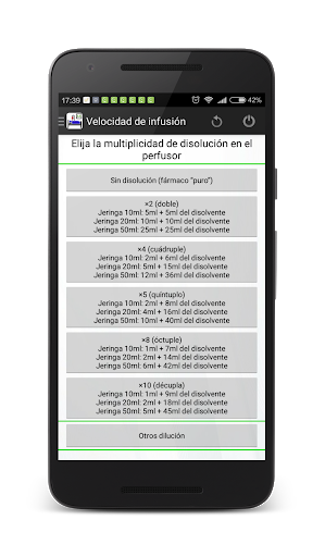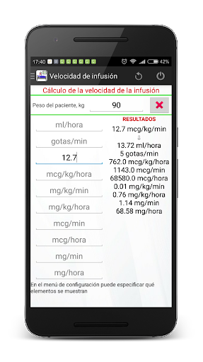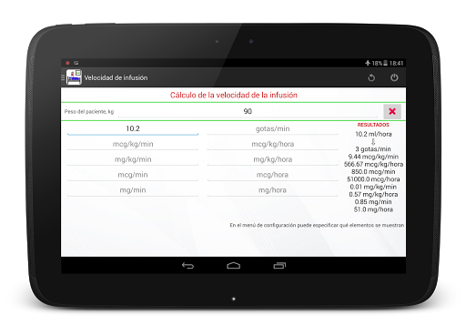 El programa permite calcular la tasa de infusión de fármacos. La conversión de ml/ hora a mg/min, mg/kg(lb)/min, mg/kg(lb)/hora, mg/hora, mcg/kg(lb)/min, mcg/kg(lb)/hora, mcg/hora se realiza rápida, simplemente y tocando la pantalla lo menos posible. En las opciones puede elegir kilógramos o libras.