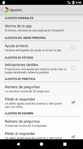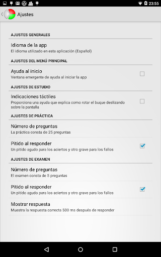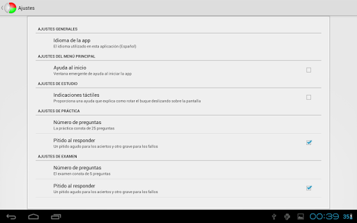 La app ofrece diversas posibilidades, como elegir el número de preguntas de los examenes, introducir pitidos según los aciertos o fallos, o cambiar el idioma.