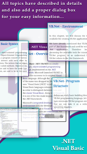 Visual Basic .NET Tutorial - Ejemplos VB .NET es una aplicación para Android ayuda a aprender Visual lenguaje de programación BASIC para ambas aplicaciones de Windows Forms y aplicaciones de consola ventanas desde los cimientos hasta nivel avanzado.
