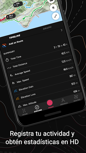Revisa tu ruta con los mejores mapas, disponibles también en 3D. Obtén la altimetría y las estadísticas precisas de cada una de tus actuaciones rastreadas. Exporta la actividad como un archivo GPX o KML.