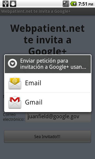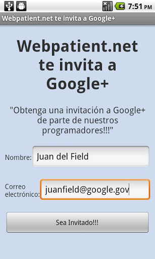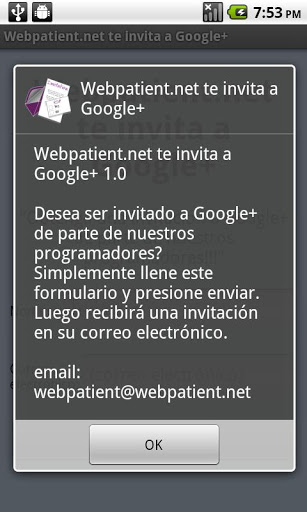 Webpatient.net te invita a Google Desea ser invitado a Google de parte de nuestros programadores? Simplemente llene este formulario y presione enviar. Luego recibirá una invitación en su correo electrónico. Gracias por su apoyo.