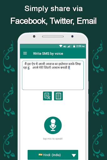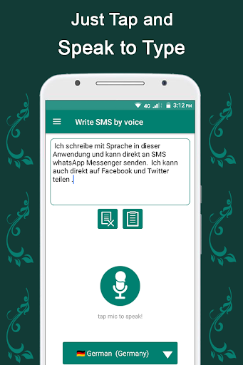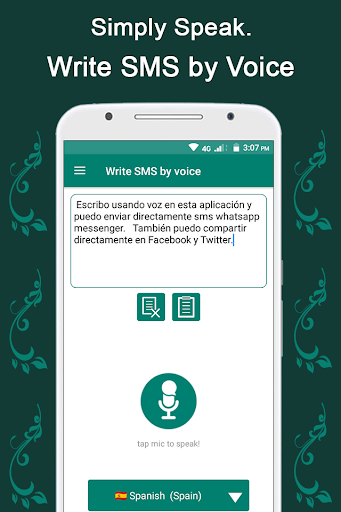 Después de obtener su SMS en el formulario de texto, lo copia. Puedes compartir tus SMS o Texto a través de WhatsApp, Messenger, IMO, Twitter, Email y Facebook. En la aplicación "Escribir SMS por voz", hay más de cien idiomas mundiales disponibles, que se hablan en diferentes países del mundo. Simplemente elige su idioma requerido y habla . Su voz se convertirá en el idioma elegido automáticamente en la aplicación "Escribir SMS por voz".