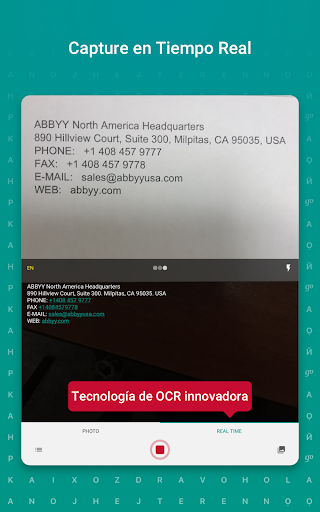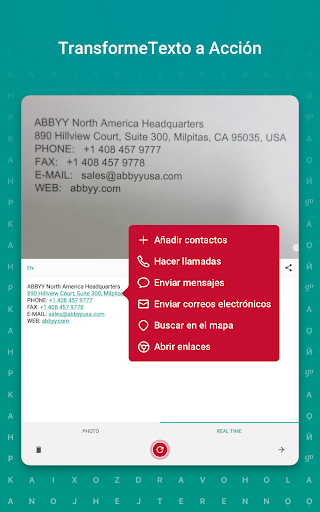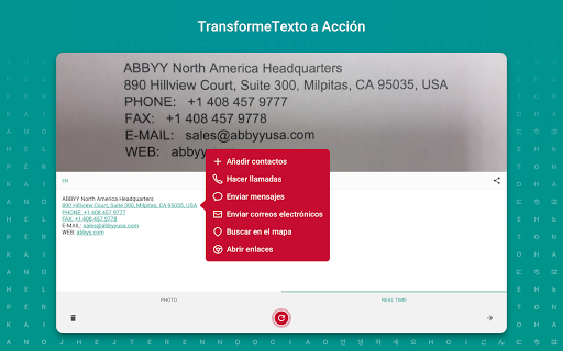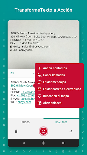 - El modo de reconocimiento en tiempo real basado en la tecnología ABBYY RTR SDK digitalizará el texto impreso directamente en la pantalla de la cámara. Podrá hacer clic en en todos los enlaces, números de teléfono y direcciones de correo electrónico después de la digitalización: puede hacer clic en el enlace, el teléfono y escribir un correo electrónico.