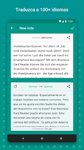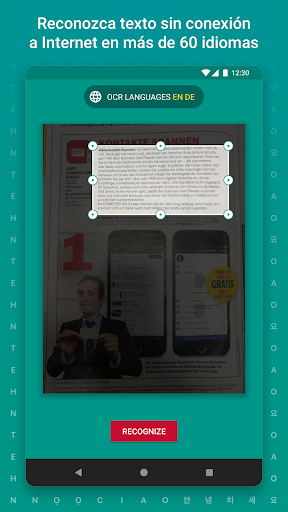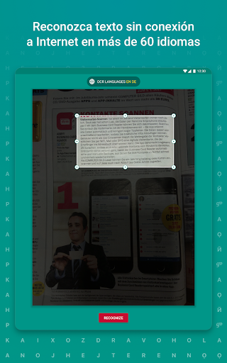 - Reconozca texto en más de 60 idiomas, incluido Inglés, Alemán, Francés, Italiano, Español, Portugués, Ruso, Chino, Japonés, Coreano y otros