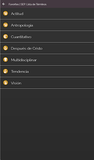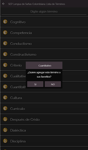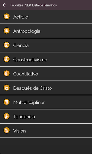 Puede buscar escribiendo o deslizandose sobre la lista hasta hallar el término de su interés, puede agregarlo a una lista de favoritos o items de consulta frecuente.