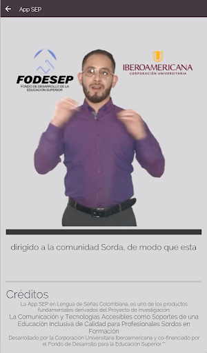 Esta versión de 'SEP: Lengua de señas colombiana', es una primera herramienta para abordar el desarrollo de la relación palabra-concepto en el Profesional Sordo en formación, de forma específica en el área de Educación (Inicialmente), esto a partir de expresiones y términos académicos y científicos propios de las disciplinas de Educación Infantil y Educación Especial, y es uno de los productos resultantes del proyecto de investigación: Comunicación y Tecnologías Accesibles como Soportes de una Educación Inclusiva de Calidad, desarrollado por el Grupo de Investigación en Educación y Escenarios de Construcción Pedagógica de la Corporación Universitaria Iberoamericana, el cual para su desarrollo contó con un significativo aporte del Fodesep -Fondo de Desarrollo de la Educación Superior-.