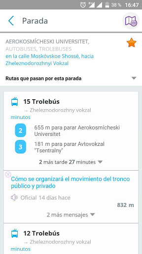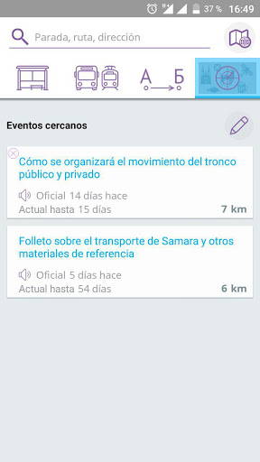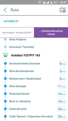 La aplicacion ofrece el pronostico de la llegada del transporte para todas las paradas de Samara.