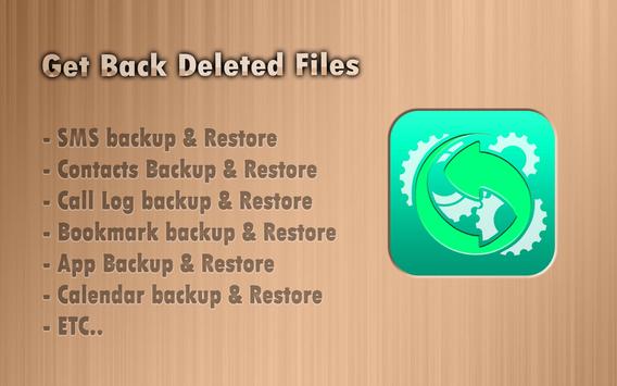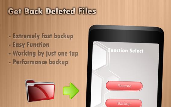 Get Back Deleted Files is a very powerful application that can backup or restore all applications and a few other things on your phone installed. You can do it with a Get Back Deleted Files put your MMS, SMS , bookmarks , call logs, system settings, alarm clock, all access points and applications are backed up. Speed ​​Save your work very fast and easy, you just press a few buttons , it will start working.
