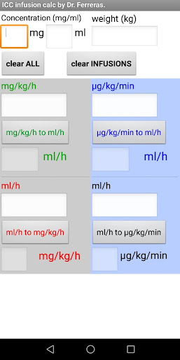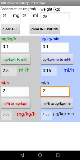 The app is a digital document which makes the change of units frequently used in intensive care. It is not a medical device so that it does not perform any manipulation in tests, diagnosis or treatment. It complies with European Union legislation on related health digital documents (mHealth). The purpose is to provide a tool for infusions calculations, with the aim of making it intuitive, fast and effective. Its use does not replace the medical criterion or the relationship with the patient. It is aimed at familiar health professionals.it has been designed by APP inventor tool. In order to avoid errors, when the necessary parameters are not entered the app will not provide any calculation. it has been tested with health professionals.If any error are detected contact the owner of the application DrFerreras,pediatric anesthesiologist (rubenferrerasvega@hotmail.com).No funding has been received for the development.Updates are made, all of them are notified to the user.The calculations are based on basic mathematical formulas for unit changes.It does not replace the health professional's criteria taking responsibility for the use of the same.Please notify possible improvements to avoid incidents related to its use to the owner's email.The use of the app is intuitive. If you have any doubts about the legislation of medical devices, you can access the page: (SPANISH LANGUAGE). https://anestesiar.org/2018/mhealth-el-uso-de-aplicaciones-moviles-en-medicina/