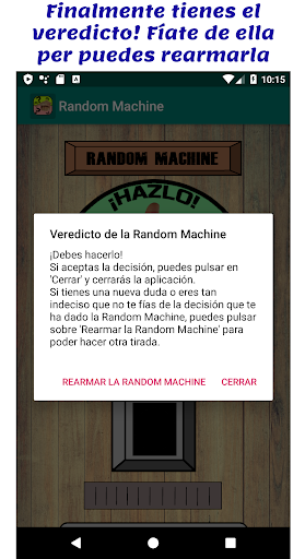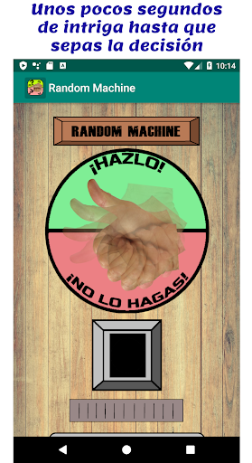 Esta aplicación te ayudará a tomar decisiones de tu día a día y además le añadirá un poco de intriga . Simplemente hazte una pregunta sobre algo que deberías hacer o no hacer y deja que la Random Machine te aconseje la decisión que debes de tomar. ¡No te arrepentirás!