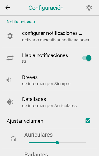 También podes elegir el modo de audio por donde se hablarán (auriculares, parlantes,bluetooth, siempre o ninguno) para las notificaciones cortas o detalladas.