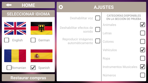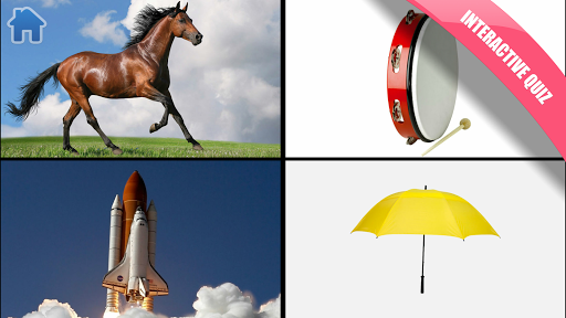 * También hay un juego de preguntas, en el que a los niños se les muestra 4 imágenes diferentes y se les pide que toquen una imagen determinada. Cuando tocan la imagen adecuada, el nombre de la imagen se reproduce de nuevo de forma que puedan recordar la respuesta correcta. Los padres pueden elegir las categorías que se mostrarán en el juego.
