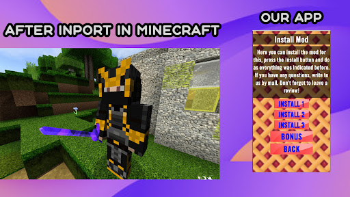 DISCLAIMER: This is an unofficial application. The name, trademark and assets are the property of the owner Mojang AB. The application helps to install and familiarize yourself with the mod for the Minecraft game, this is not a game, but an add-on with instructions! If you believe there are trademark infringements that do not fall within the "fair use" guidelines, please contact us by email.