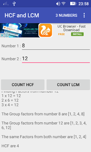 Esta aplicación puede ayudarlo a calcular entre dos números y tres números y mostrar cómo encontrar en detalle HCF y LCM.